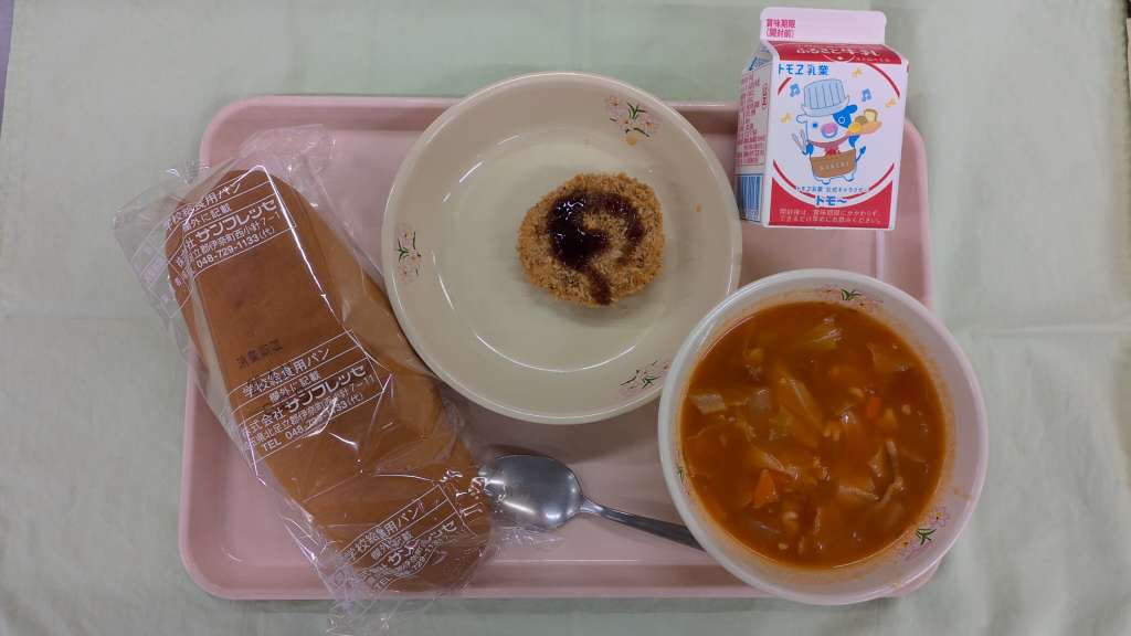 4月10日(金)の給食 ロールコッペ ツナポテトコロッケ ミネストローネ 牛乳 今日から給食が始まりました。 初日は手作りのコロッケと野菜たっぷりの ミネストローネです。 子供たちの「初日からとってもおいしいです!」 「もっと食べたいです!」の声が 大きな励みになりました。 今年度もおいしい給食を作ります。 たくさん食べてくださいね。